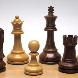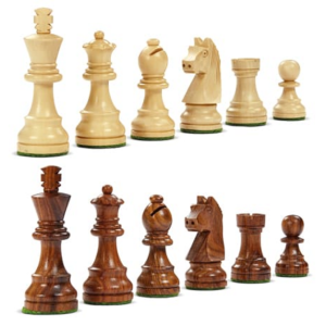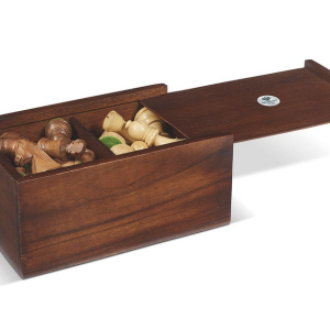 In a wooden Box, Brown stained and natural wood, polished, weighted, hand carved knights.