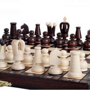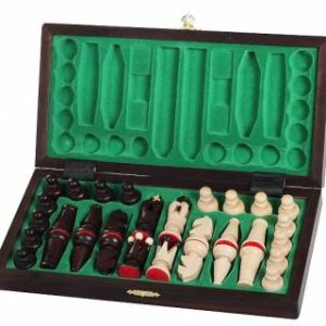 A metallic chess set in a wooden case. The board measures 28cm x 28cm and is made of brass having the chess pieces made of Zinc Alloy 5
