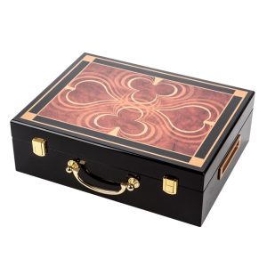 This poker chip case is wooden. It is lacquered to a high gloss black finish with a spades and clubs