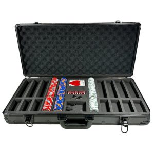 Poker chip set in black color aluminium case,  including 500 Monte Carlo 14gr chips, two decks Lazar playing cards 100%