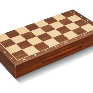 Folding walnut chess board with letters and numbers. The set includes  wooden chessmen h. King 76mm Closed board dimensions: 36.8x18x5 cm