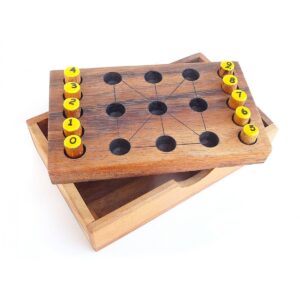 MATH MIND PUZZLES + 1 BOARD GAME TIC-TAC-TOE CHALLENGES: 1.Place the pegs 1-9 in the central square to obtain the