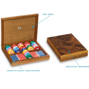 Chips box made of walnut briar, complete with chips with a matte finish that gives a pleasant feeling of weight