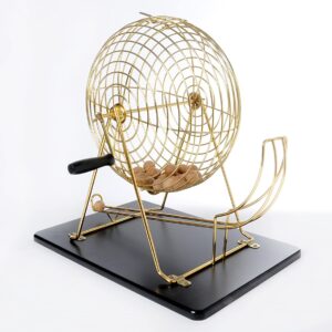 Large Bingo. Height 43 cm. Metal copper mill. Basket diameter is  31 cm. Brown coated wooden MDF base. With 90
